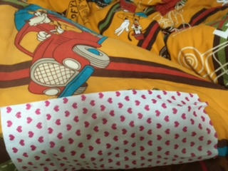 大事なグーフィーの布団カバーが裂けてたから布を紙布用のボンドで貼っつけてつぎはぎした。100円ショップでなんとなく選んだ布だけど、こうして見るとグーフィーさんのパンツ感あるwww